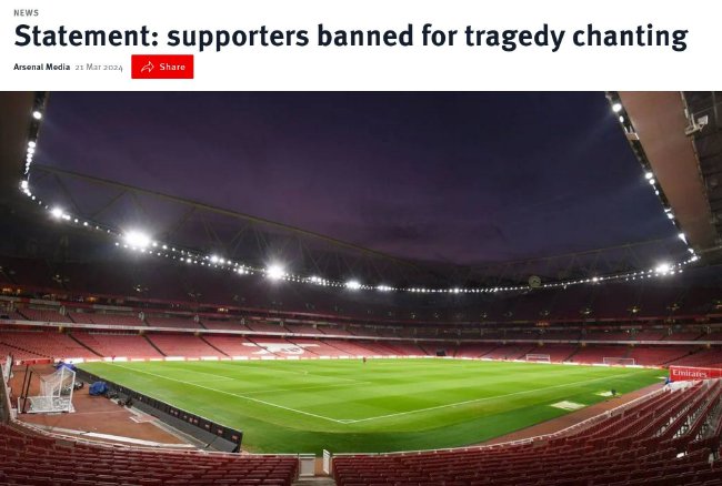阿森纳官方:骚扰利物浦的阿森纳球迷禁赛3年