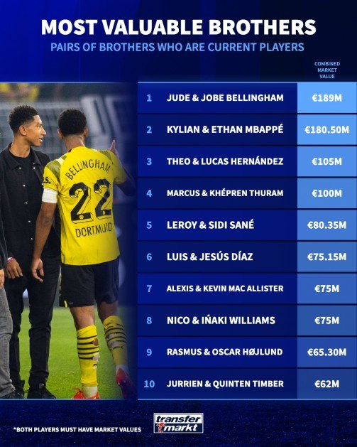 德转列足坛兄弟身价榜:贝林兄弟1.89亿欧居首